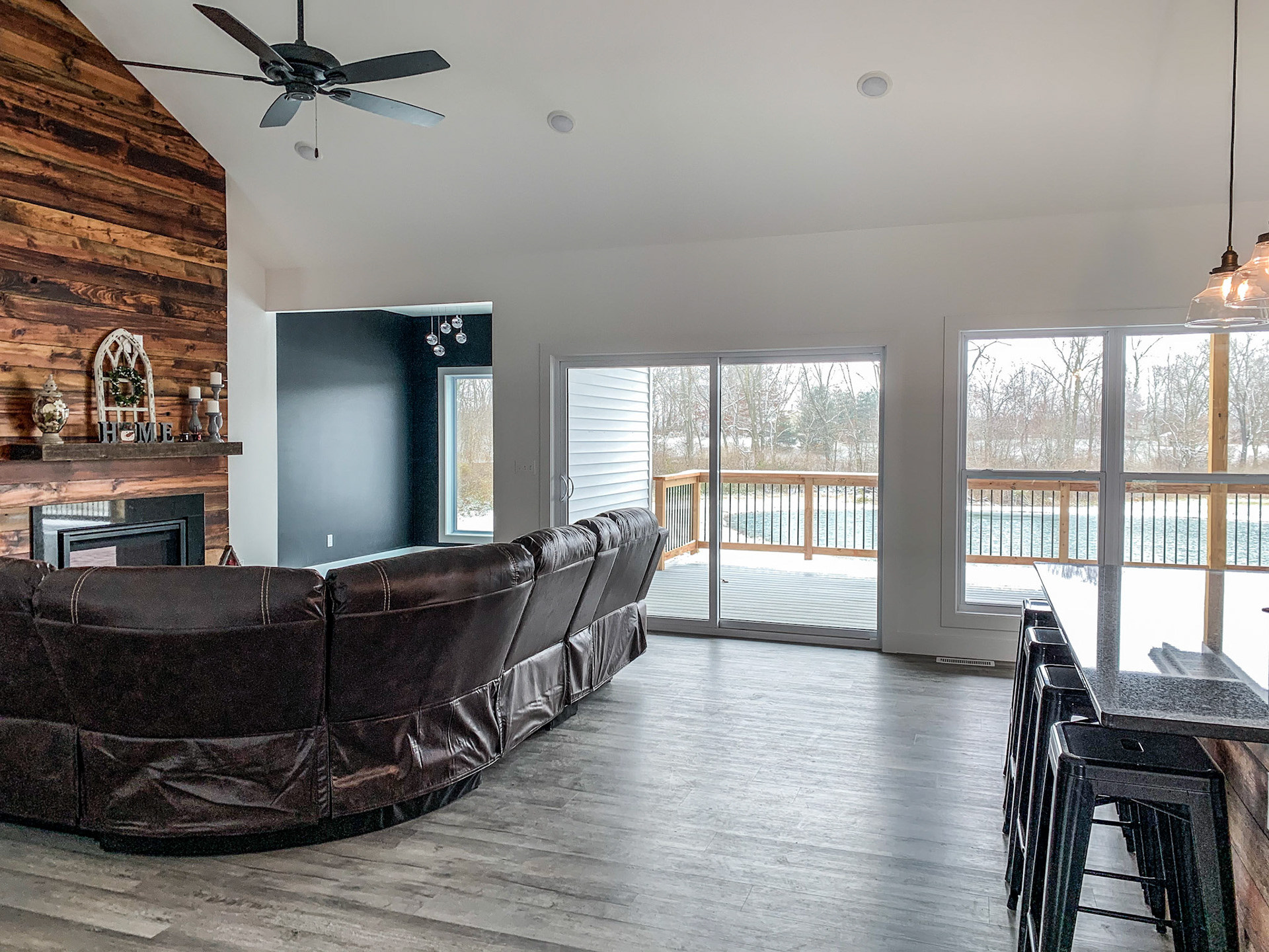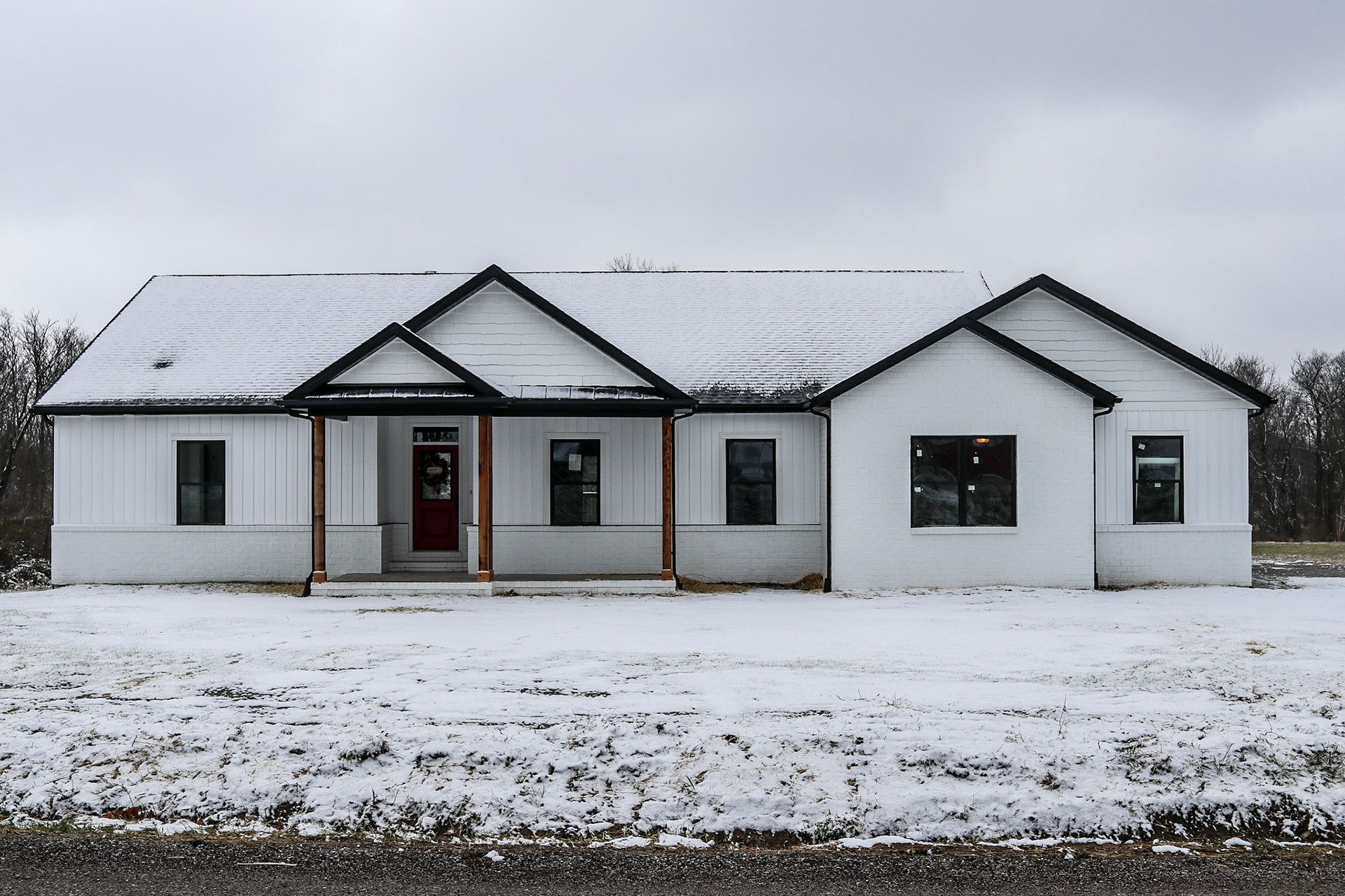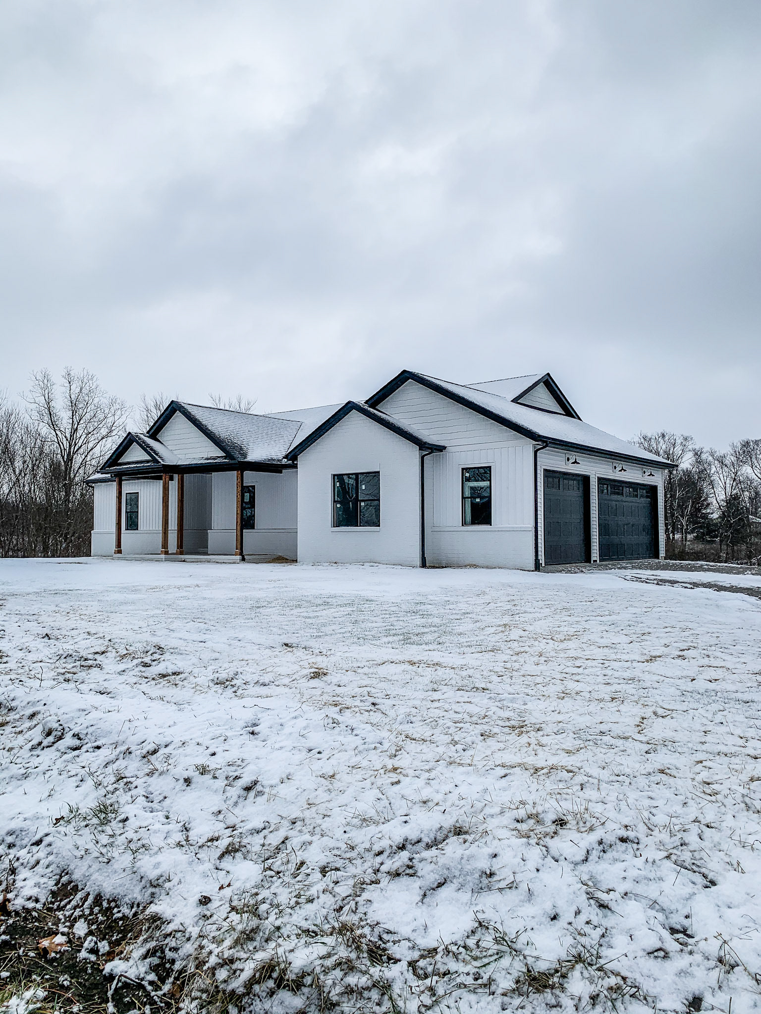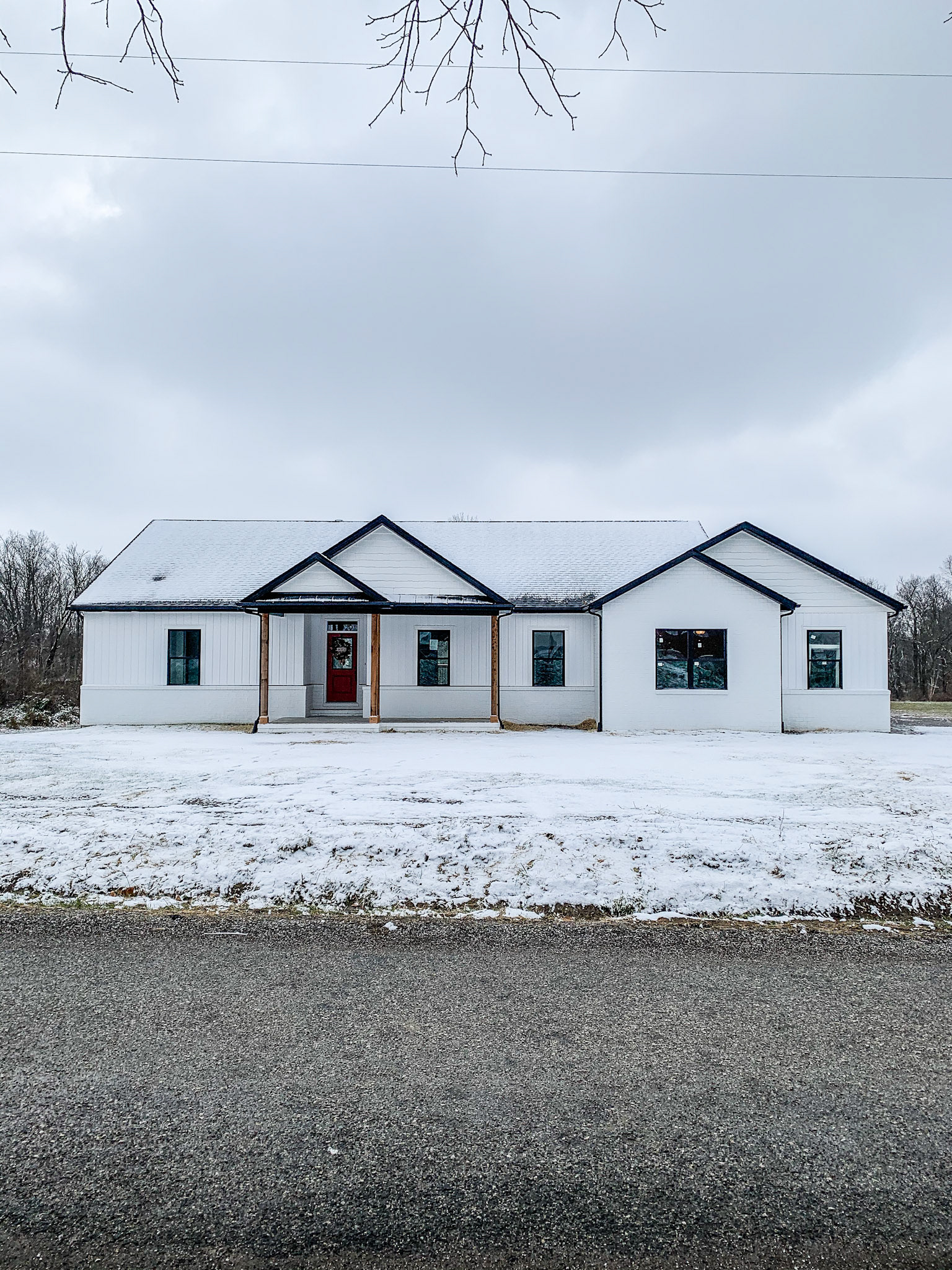 This beautiful modern farmhouse style ranch was a custom home build featuring a covered outdoor entertaining deck, a piano room, and a private master screened-in porch. This custom home was completed by a beautiful pond addition to the property!